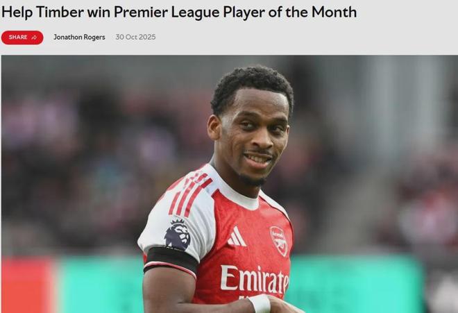 官方:廷贝尔被提名为了英超10月份最佳球员候选。