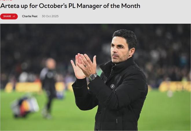 官方:阿尔特塔被提名为了英超10月份最佳主帅候选。